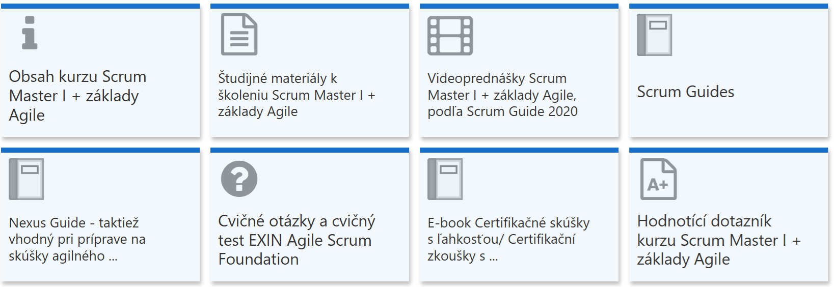 - možnosť dokúpiť si elektronickú publikáciu Agile Scrum Handbook vhodnú pre prípravu na skúšku Agile Scrum Foundation